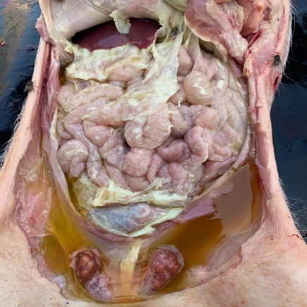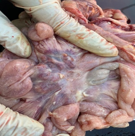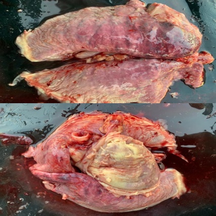 - Ở heo cai sữa, heo choai, có thể xuất hiện bệnh tích loét da ở những vùng rìa tai, đuôi, mõm. Mổ khám có thể ghi nhận được các bệnh tích như: viêm màng và tràn dịch xoang bụng, ngực, bao tim, vách tim mỏng, tim nhão, lách sưng, hạch sưng.