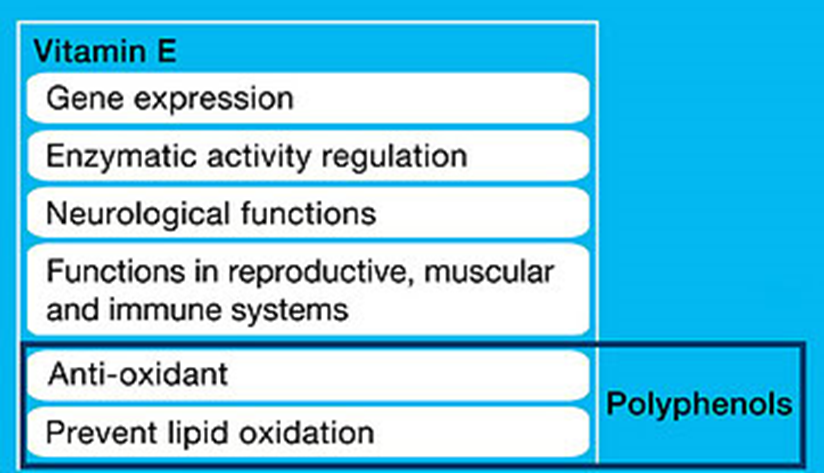- Polyphenol được lựa chọn cẩn thận có thể đáp ứng nhu cầu chống oxy hóa của động vật, hiện được cung cấp bởi vitamin E cũng như các polyphenol bổ sung hỗ trợ thêm khả năng chống oxy hóa vượt ra ngoài môi trường lipid. Sự hoán đổi chiến lược này cung cấp một chiến lược đa diện hỗ trợ bảo vệ chống lại các gốc tự do và giúp bảo vệ sức khỏe và hiệu suất của động vật.