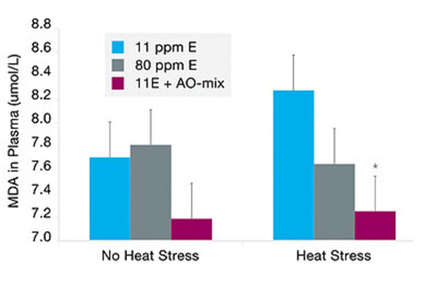 Hình 4. Selko AOmix kết hợp với vitamin E làm giảm mức MDA (dấu hiệu của stress oxy hóa) ở lợn con trong điều kiện stress nhiệt. Nutreco R&D hợp tác với Đại học Gent, 2012.
