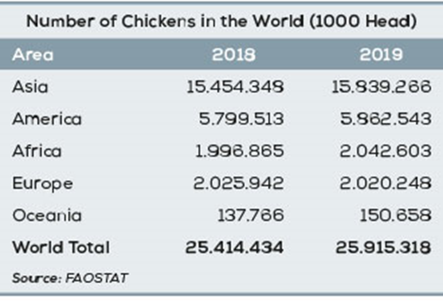 - Theo dữ liệu từ Tổ chức Lương thực và Nông nghiệp Liên hợp quốc (FAO), tổng số gia cầm hiện diện trên thế giới (gà, vịt, ngỗng, gà lôi và gà tây) là khoảng 27,9 tỷ con vào năm 2019. Phần lớn nhất trong số này thuộc về gà, với khoảng 93 phần trăm. Theo FAO, số lượng gà trên toàn thế giới đã tăng gấp đôi kể từ năm 1990. Số lượng gà, là 14,38 tỷ con vào năm 2000, đã đạt 25,9 tỷ con vào năm 2019. Phần lớn nhất trong số này thuộc về các nước châu Á. Trong cùng kỳ, tổng số gà hiện diện ở châu Á là 15,8 tỷ con. Tiếp theo là châu Mỹ với 5,8 tỷ con. Số lượng gà hiện diện ở châu Phi và châu Âu là khoảng 2 tỷ con mỗi nơi.