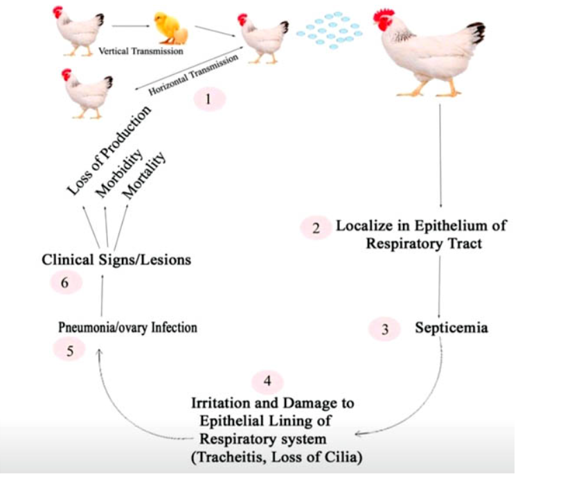 - MG kết hợp với virus ILT – virus Infectious Laryngotracheitis và IB (viêm phế quản truyền nhiễm) là phổ biến. Ngoài ra, MG còn kết hợp với các bệnh do virus khác như cúm gia cầm, bệnh Newcastle và viêm phế quản truyền nhiễm.