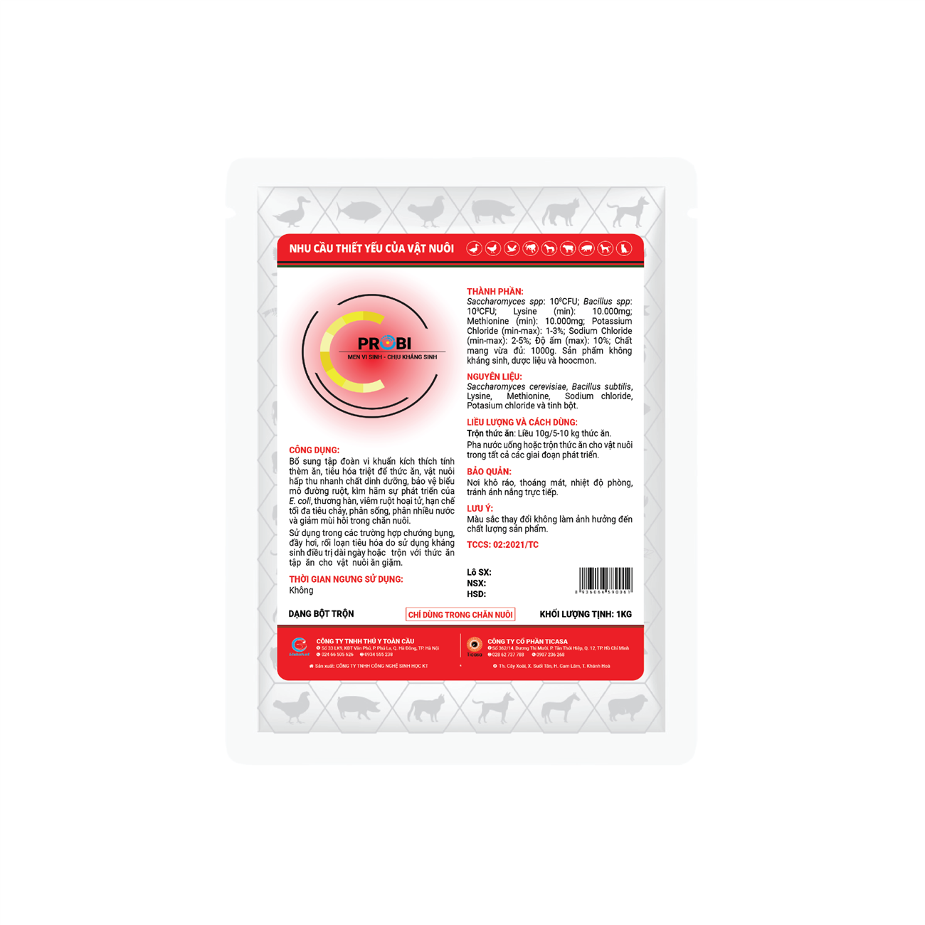Saccharomyces cerevisiae: 108CFU; Bacillus subtilis: 108CFU; Lysine (min): 10.000mg; Methionine (min): 10.000mg; Potassium Chloride (min-max): 1-3%; Sodium Chloride (min-max): 2-5%; Chất mang vừa đủ: 1000g