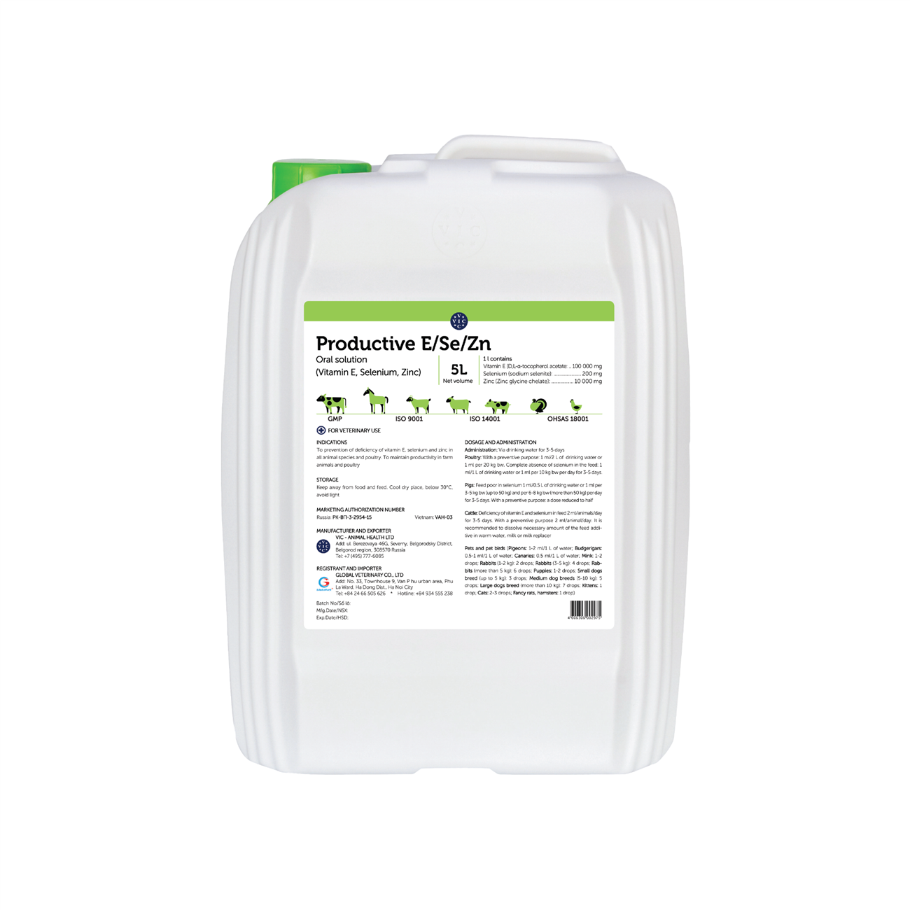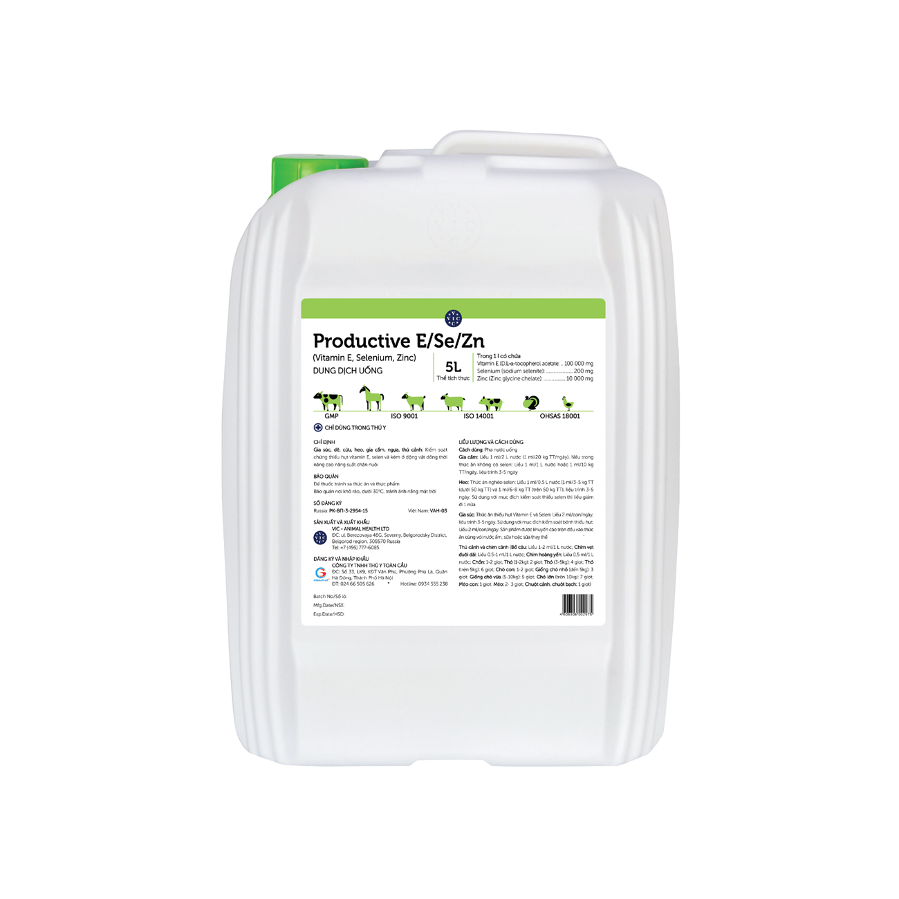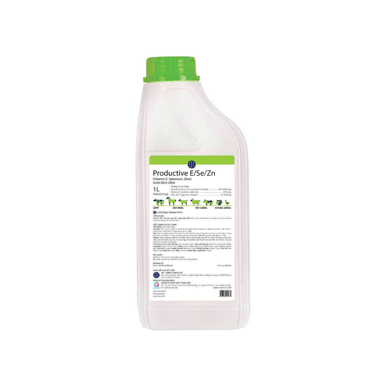 Productive E/Se/Zn được sử dụng để duy trì năng suất sản xuất cao cho trang trại chăn nuôi gia súc và gia cầm. Phòng trứng thiếu hụt Vitamin E, Selen, Kẽm gây ra suy yếu hệ miễn dịch, suy giảm khả năng sinh sản.