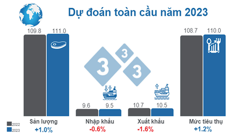 Bước sang năm 2023, hầu hết các dự báo đều cho thấy, bên cạnh những mảng màu sáng tích cực còn đan xen những mảng màu tối gây cản trở cho ngành chăn nuôi toàn cầu. Theo dự báo mới nhất của Bộ Nông nghiệp Mỹ (USDA), với ngành heo, sản lượng thịt heo toàn cầu được sẽ tăng 1% vào năm 2023 lên 111 triệu tấn. Nguyên nhân chủ yếu là do Trung Quốc, quốc gia chiếm 47% sản lượng thế giới dự kiến sẽ sản xuất 52 triệu tấn thịt, tăng 2% so năm 2022 (51 triệu tấn). Sản lượng thịt heo của Mỹ sẽ tăng 1% lên 12,4 triệu tấn do sản lượng ngũ cốc khiến giá thức ăn tăng, mặt khác các trang trại có xu hướng kéo dài thời gian xuất chuồng nên khối lượng heo hơi tăng hơn khoảng 10%. Mặc dù sản lượng thịt heo toàn cầu được dự báo sẽ tăng trong năm 2023, nhưng xuất khẩu lại được cho là sẽ giảm 1,6%, xuống 10,5 triệu tấn. Điều này chủ yếu là do Trung Quốc sẽ giảm nhập khẩu vì nguồn cung trong nước đã được cải thiện. Xuất khẩu của EU được dự báo sẽ giảm 3,6% do công tác vận chuyển thịt heo sang Trung Quốc gặp khó khăn và sản lượng trong khối giảm. Đối với gà: Sản lượng thịt gà toàn cầu dự kiến sẽ tăng 2% vào năm 2023, đạt 102,7 triệu tấn. Phần lớn các nhà sản xuất gia cầm trên thế giới (ngoại trừ Trung Quốc) dự kiến sẽ có lãi trong năm tới, trong đó Brazil là quốc gia có tăng trưởng đáng kể nhất. Xuất khẩu thịt gà toàn cầu dự báo sẽ tăng 3,7% vào năm 2023 lên 14,1 triệu tấn.