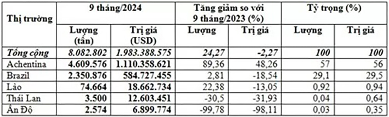 - Trong 9 tháng đầu năm 2024, Argentina là nhà cung cấp ngô lớn nhất cho Việt Nam, chiếm tới 57% tổng lượng và 56% tổng kim ngạch nhập khẩu ngô của cả nước. Cụ thể, Việt Nam đã nhập khẩu từ Argentina gần 4,61 triệu tấn, với giá trị tương đương trên 1,11 tỷ USD. Giá trung bình của ngô nhập từ Argentina trong thời gian này là 240,9 USD/tấn. So với cùng kỳ năm 2023, lượng nhập khẩu tăng mạnh tới 89,4%, và kim ngạch tăng 48,3%, nhưng giá giảm khoảng 21,7%