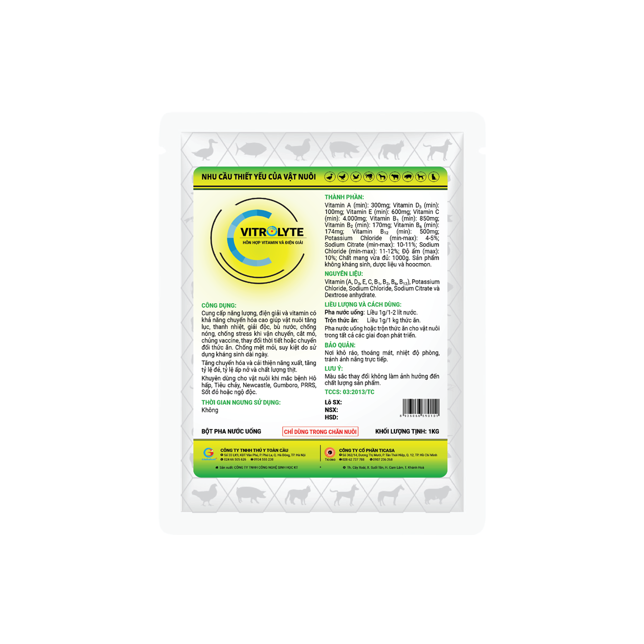 Pha nước uống hoặc trộn thức ăn cho vật nuôi trong tất cả các giai đoạn phát triển.